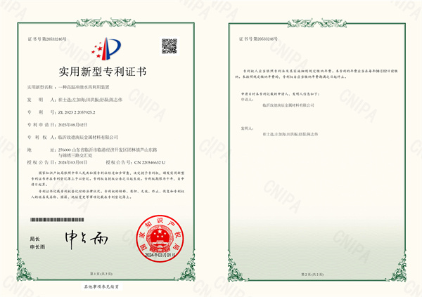近日,經國家知識產權局審批,臨沂玫德庚辰金屬材料有限公司自主研發并申報的“一種高溫沖渣水再利用裝置”成功獲得國家知識產權局授權,并獲得實用新型專利證書,專利號為:ZL 2023 2 2057025.2。
