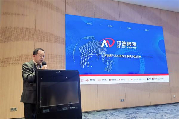 水務智能研發部總監董天暉參加9+2水司舉辦的供水分論壇,就《不銹鋼產品在直飲水系統中的應用》為題講述了玫德集團的水務領域產品涵蓋從源頭(水源接入)到龍頭(飲水入戶),提供從清潔原水到污水處理的一站式解決方案。